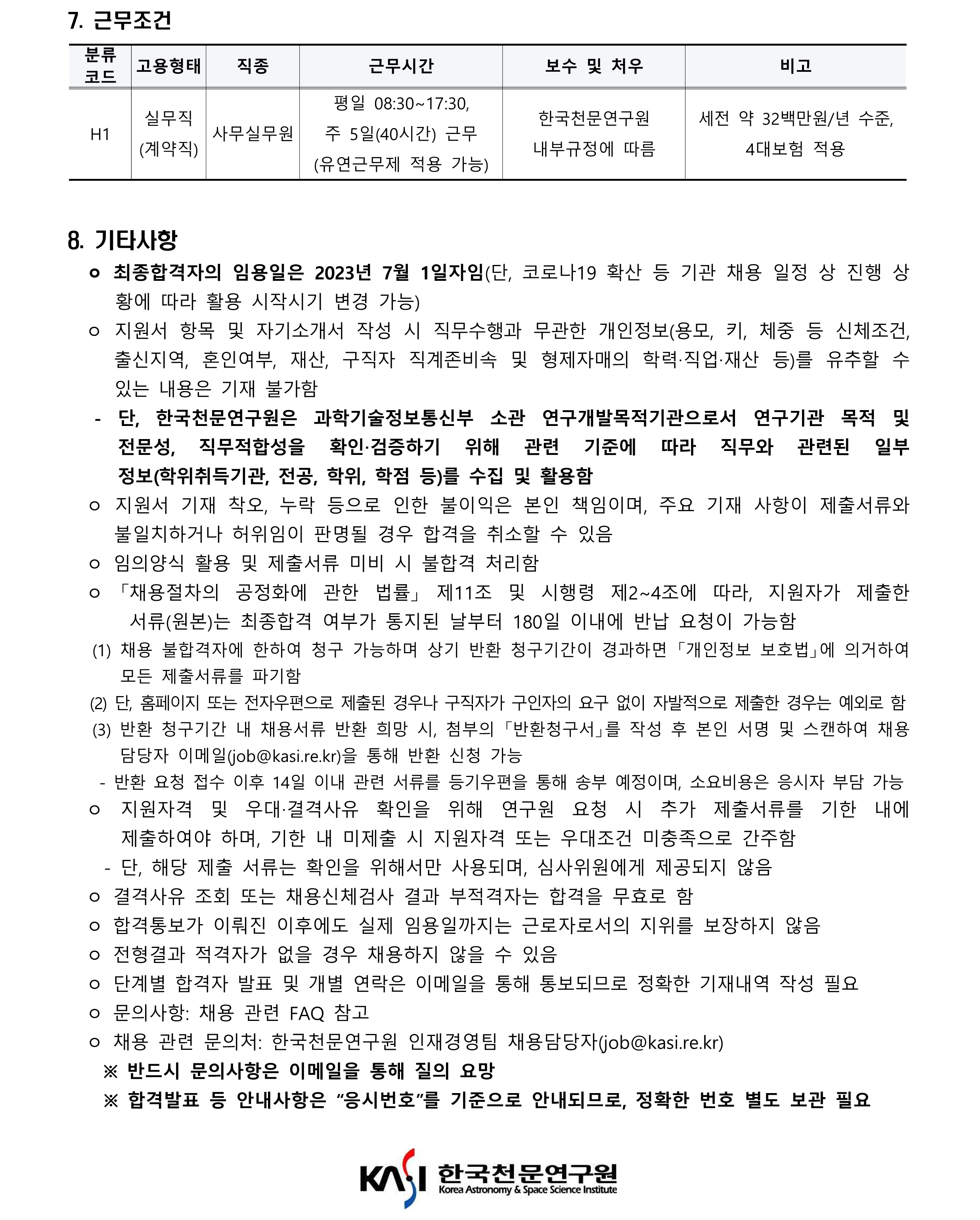 | H1 | 실무직(계약직) | 사무실무원 | 평일 08:30 ~ 17:30, 주 5일(40시간) 근무 (유연근무제 적용 가능) | 한국천문연구원 내부규정에 따름 | 세전 약 32백만원/년 수준, 4대보험 적용 |